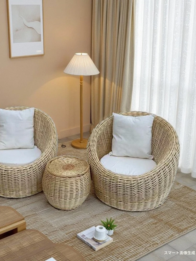 住宅用の創造的なラタン製一人掛けソファ - おしゃれなラタンチェア、リラックスできるバルコニー用、茶卓付きのデザイン家具で、心地よいひとときをお楽しみください!