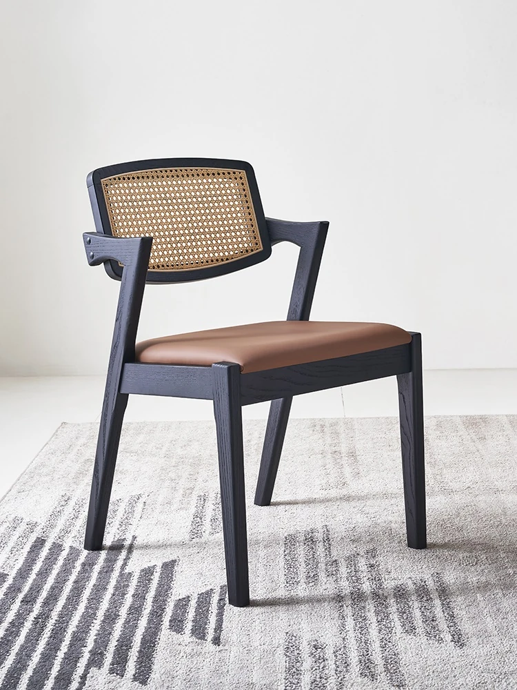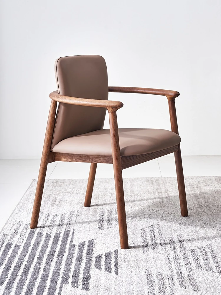 Moban Vintage-Style Dining Chair in Ash Wood with Armrests - Soft-Padded, Premium Genuine Leather for Nordic-Inspired High-End Hotels and Villas - Perfect for Your Dining Room