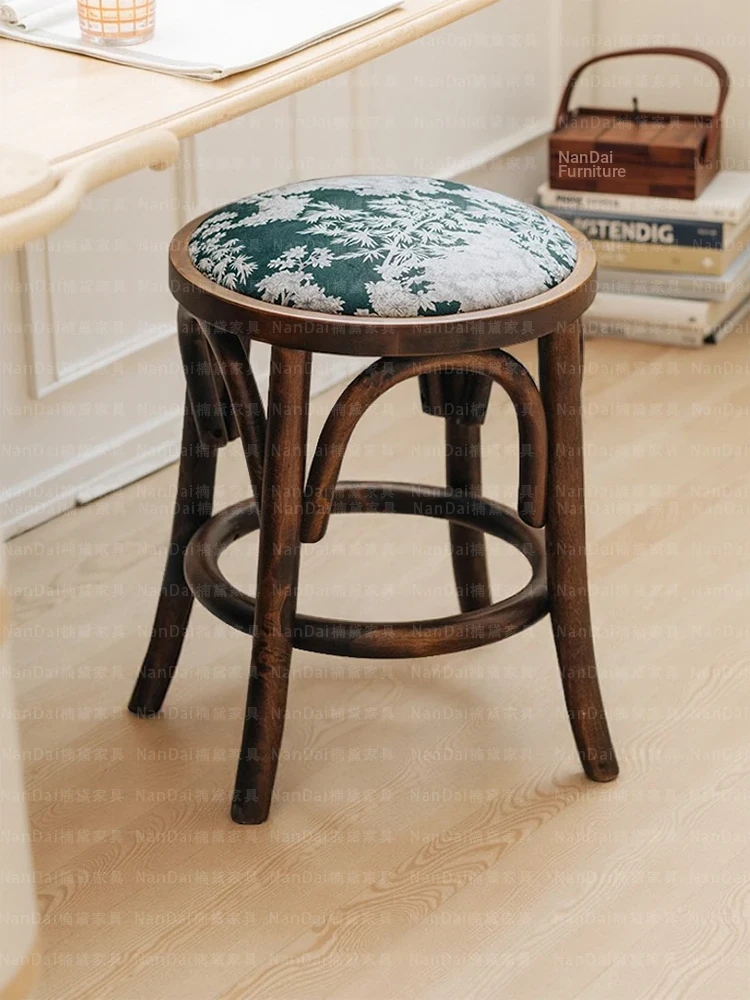 French Vintage Upholstered Makeup Stool - Cozy Home Dining Chair, Retro Solid Wood Round Bench for Dressing, Entryway, and Tea Time - Perfect for Changing Shoes and Adding Charm to Your Space!