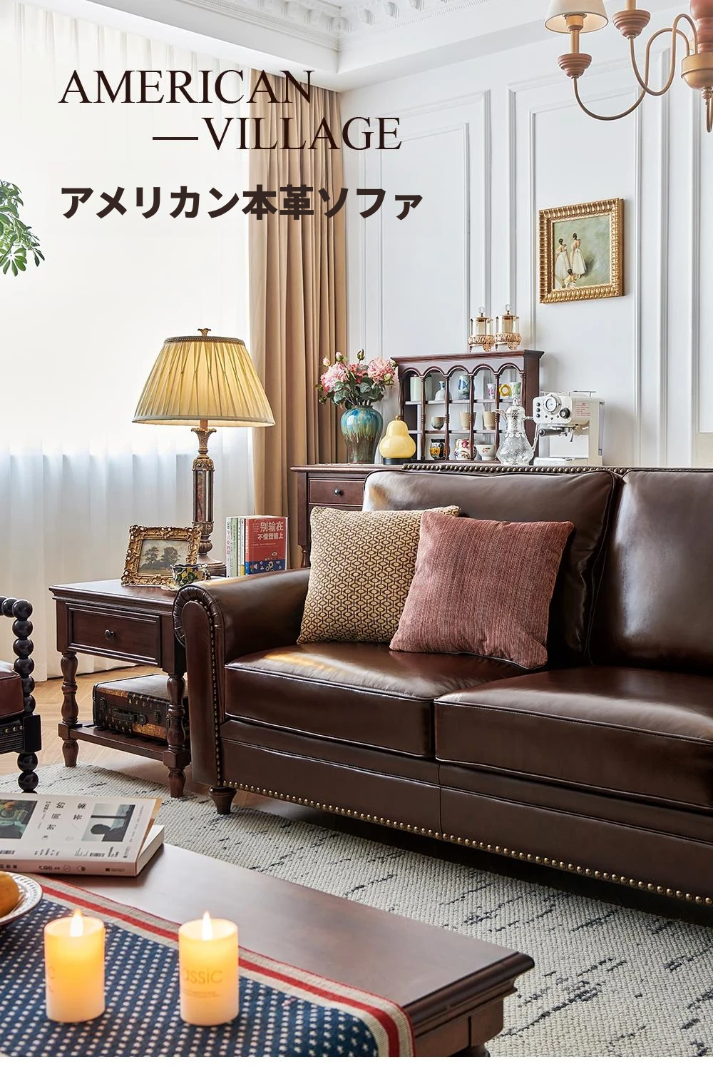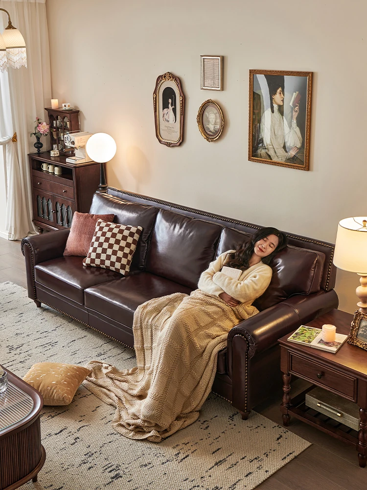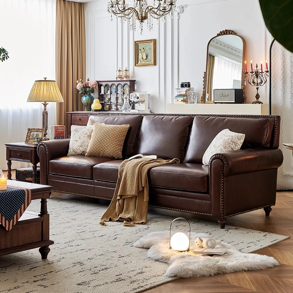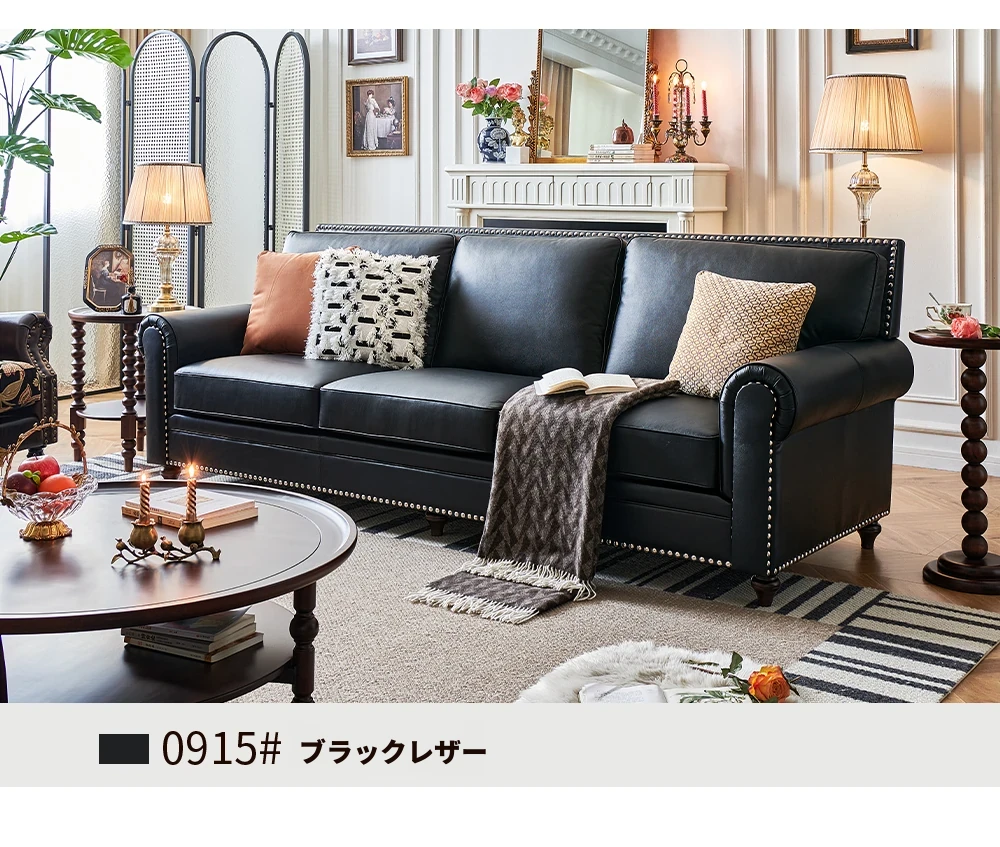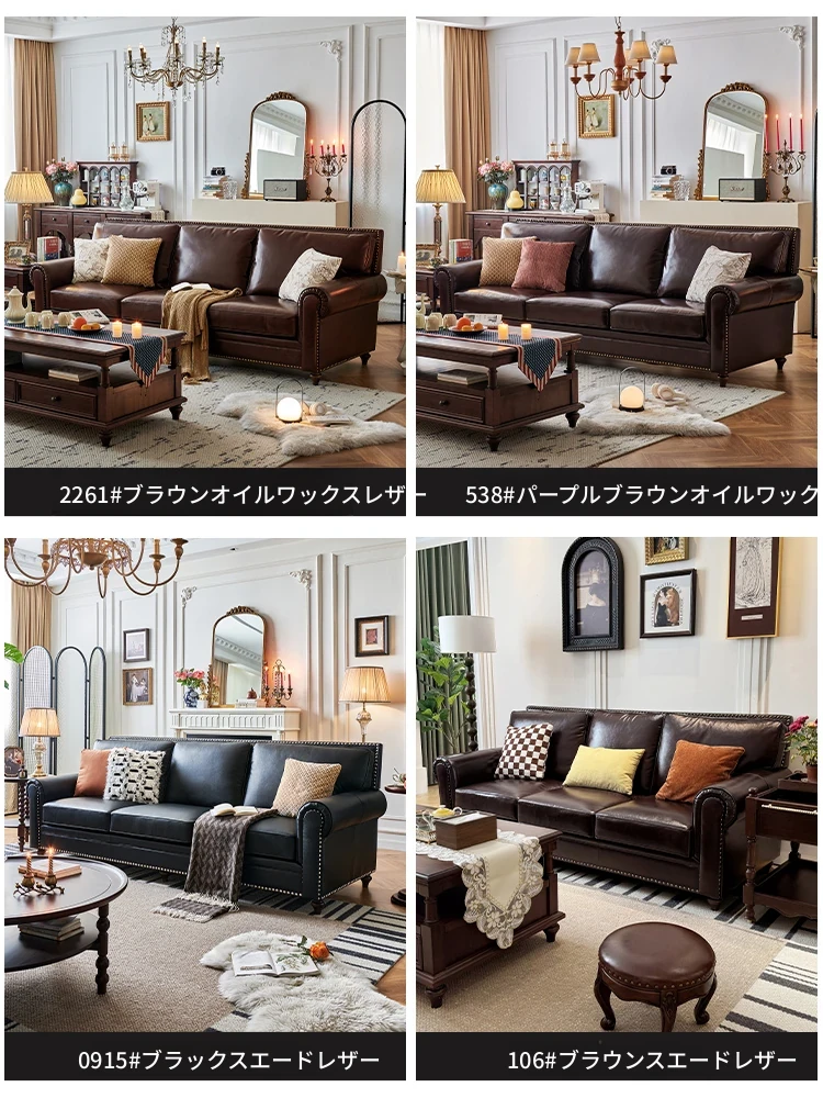 アメリカンスタイルのソファ、大バトンブラウンオイルワックスレザー 本革本皮の4人掛けヴィンテージリビングルーム家具。高級感あふれるデザインで、居心地のよい空間を演出します!
