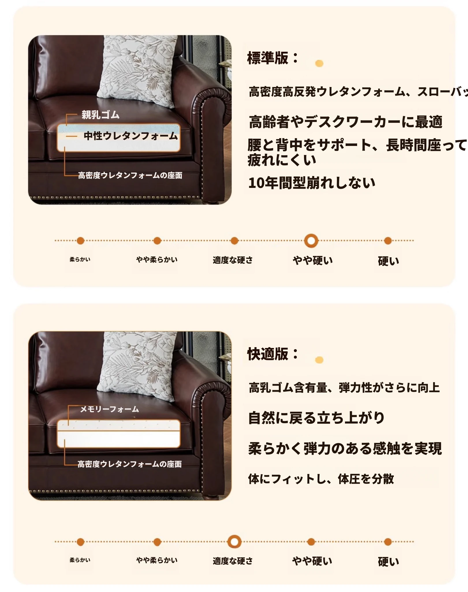 トップレイヤーオイルワックスレザー【コンフォート版】ラテックス+高密度スポンジクッション 硬さは適度