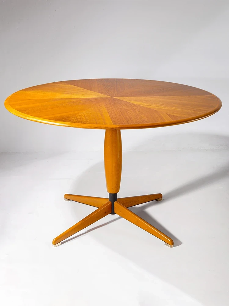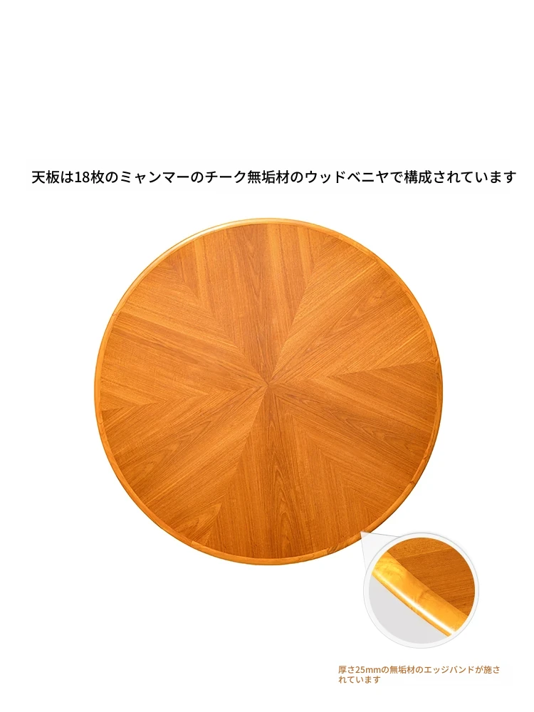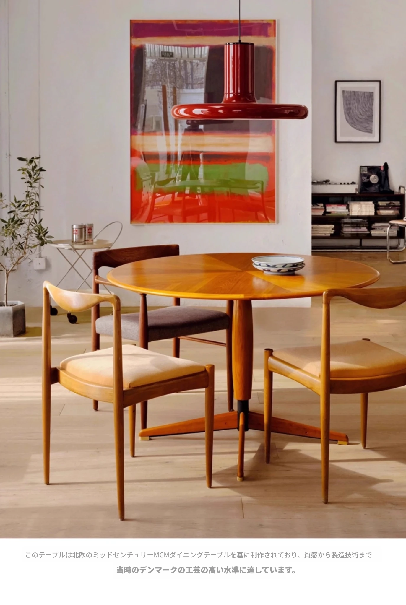 MCMスタイルのクロスレッグ・チーク材ラウンドダイニングテーブル